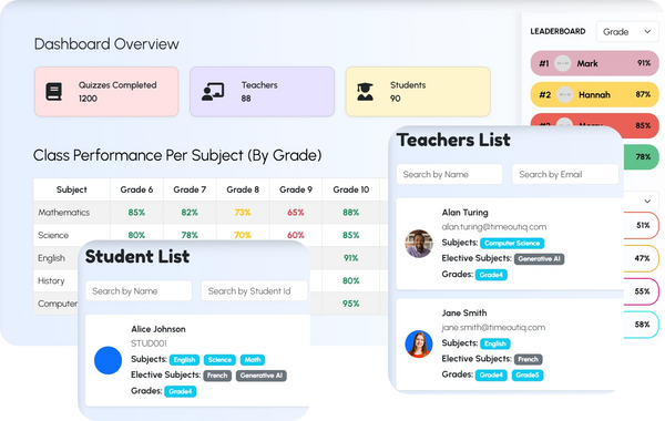 Our interactive school dashboard provides a clear, real-time view of academic performance and engagement. From tracking quizzes completed to monitoring class performance across subjects, it’s designed to help educators make informed decisions. Teachers and students can be easily managed through searchable lists that display key details such as contact information, subjects, electives, and assigned grades. The color-coded performance table highlights strengths and areas for improvement across multiple grades, while the dynamic leaderboard celebrates top achievers and encourages healthy competition. With its clean design and intuitive navigation, the dashboard ensures seamless access to the data that matters most.