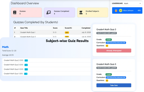 The student quiz dashboard offers a clear and organized view of academic progress, making it easy to track performance across enrolled subjects. At a glance, students can see the number of quizzes assigned, completed, and their enrolled subjects, along with a detailed breakdown of scores and percentages for each quiz. The subject-wise quiz report provides total scores, averages, and individual quiz grades, helping learners identify strengths and areas for improvement. Each quiz card displays essential details such as grade, curriculum, and number of questions, with clear indicators for attempts and quick access to start new quizzes. A real-time subject leaderboard adds a competitive edge, motivating students to aim higher while staying engaged in their learning journey.