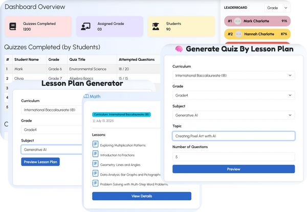Our advanced teacher dashboard combines performance tracking, lesson planning, and quiz creation into one seamless platform. Educators can instantly view key metrics such as total quizzes completed, assigned grades, and student counts, along with detailed quiz performance data for each student. The integrated Lesson Plan Generator allows teachers to select a curriculum, grade, and subject to automatically generate structured lesson plans with ready-to-use topics and resources. Complementing this, the Generate Quiz by Lesson Plan feature enables quick creation of tailored quizzes based on specific lessons or topics, complete with customizable question counts. With its intuitive interface, real-time leaderboard, and streamlined workflow, the platform empowers teachers to save time, stay organized, and focus on delivering impactful learning experiences.